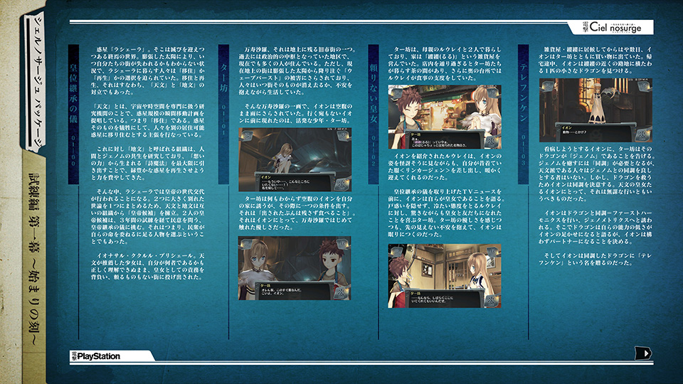 PS3、PSP、PSVitaで見ることができる電子書籍「電撃シェルノサージュ創刊号」は、第一幕、第二幕の流れのまとめを中心とした、資料本的な書籍となっています。