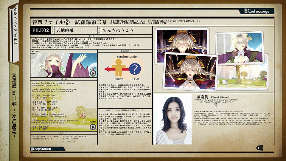 ゲーム内に出てきた用語説明の掲載などもあり、見逃してしまった部分や忘れてしまった部分も簡単に見る事が可能です。 また、紅月氏による殴り書き文書や、詩の発動設定や詩曲の資料など、このPlayViewでしか見られないコンテンツも。