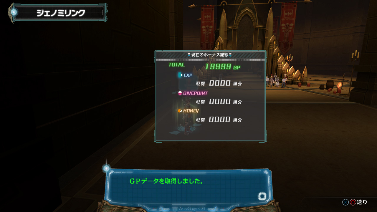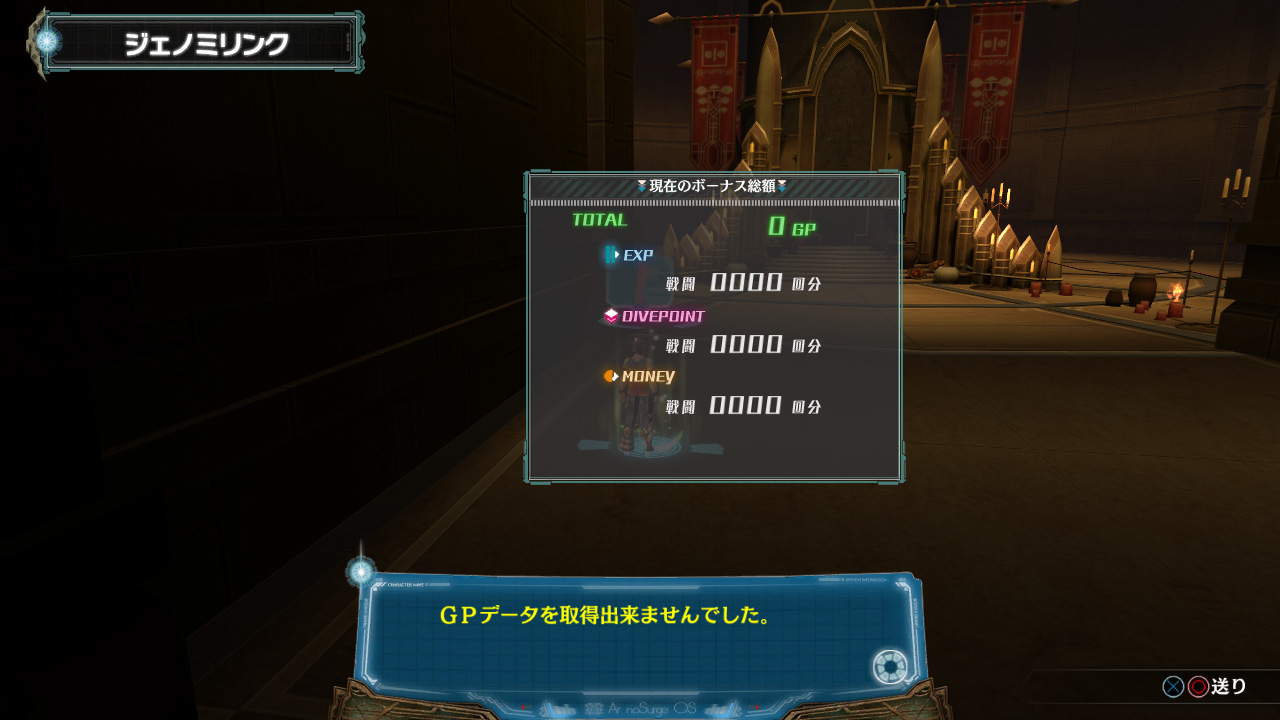 PS3®ソフト「アルノサージュ~生まれいずる星へ祈る詩~」ゲーム内の「セーブポイント」又は「レストルーム」にて、『ジェノミリンク』⇒「GPフュージョン」を実行します。